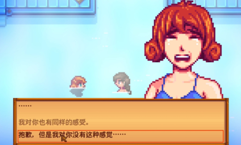 温泉最重要的专属剧情任务与NPC潘妮相关。当玩家与潘妮的好感度达到十星(满心)后,会收到她的一封来信,邀请你在晚上7点到凌晨12点之间前往温泉的泳池区域。在温泉中与潘妮对话会触发特殊剧情,当她说出有关感情的表白时,玩家将面临关键选择。选择我对你也有同样的感受会触发浪漫的接吻剧情,标志关系正式确立;而选择抱歉,但是我对你没有这种感觉……则会大幅扣除好感度并导致潘妮伤心离开,这个选择会直接影响你与潘妮后续关系的发展。