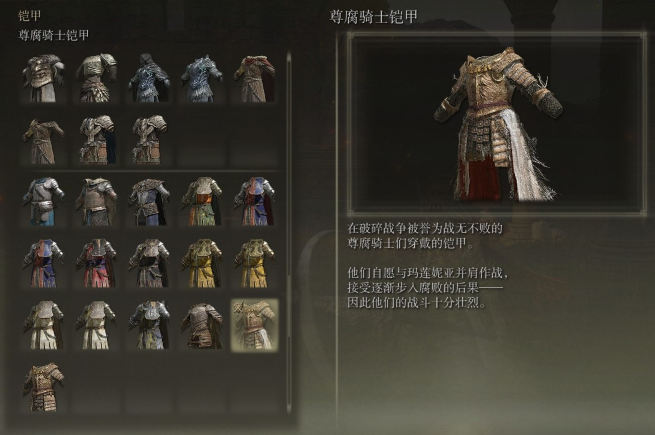 如果追求均衡属性,失乡骑士套装是性价比极高的选择。这套分轻重两个版本,轻装版适合需要灵活翻滚的敏捷流派,重装版则提供更高减伤率。它的防御与重量比例非常优秀,刷取地点在利耶尼亚地区的黑刀地下墓地门口,反复背刺守卫就能掉落。另外莱恩尼尔套装魔抗突出,适合应对法师类敌人,获取方式相对简单,打完王城主线就能捡到。