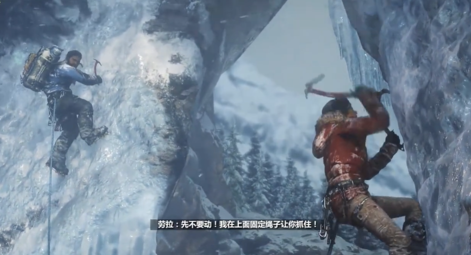 中途会遇到冰层坍塌的意外,咱们会悬挂在半空。这时需要前后摇动摇杆让身体摆动,看准时机跳到对面冰墙,最接近的瞬间按下互动键让登山斧钩住冰面。如果没抓住就得重来,所以反应要快。爬上冰墙顶后,远处突然发生雪崩,必须立刻逃跑。这段路右侧是陷阱,稍微偏右就会陷进雪里掉下去,保持直线前进,一路跳到滑索上就能暂时躲开雪崩。