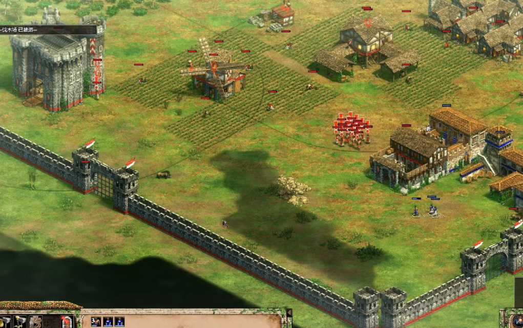 初始阶段,玩家应着重发展经济和稳固基地。工人们需要立即收集食物、木材和黄金,以繁衍更多村民并生产士兵;由于黄金采集较慢,需合理分配工人数量。在副基地下方,为红色部落建造五座箭塔是关键任务,这能加强盟友防御并推进主线。贝贾掠夺者会从多个方向持续进攻,建议使用木栅栏封锁西北和东南的出兵点,减少骚扰压力,只保留海盗作为主要海上威胁;主基地升级到城堡时代后,应在关键位置补充城堡以稳定局势。