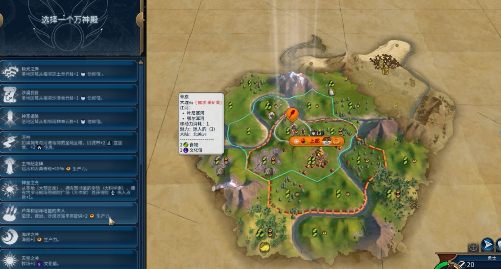 使用秦始皇领导中国文明时,创立万神殿是游戏早期的关键目标。要获得创立万神殿的机会,首先需要为你的文明积累一定数量的信仰值。在标准游戏速度下,当累计信仰达到25点时便会自动触发,而在联机速度下则只需12点。开局阶段需要积极寻找获取信仰的途径,例如优先发现与宗教相关的城邦并成为其宗主,或者改良能提供信仰的奢侈资源(如染料、烟草),这有助于你更早地触发万神殿选择界面,从而在众多选项中抢得先机。