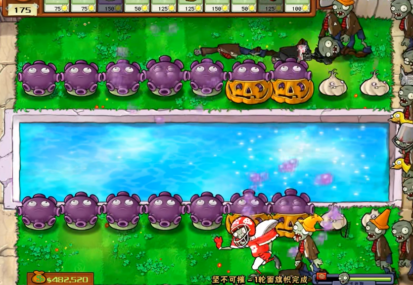 实战中需灵活调整细节,当红眼巨人僵尸密集进攻时,预留寒冰菇与火爆辣椒作为应急控场手段,快速冻结或清除突破防线的僵尸群。阵型弱点集中在第三、四行的后端区域,此处冰西瓜溅射覆盖较弱,南瓜头消耗速度快,需频繁检查并及时补位。浓雾场景需在阵型中轴与两侧加入灯笼草,破解视野限制;屋顶场景则将阵型调整为十炮布局,保持稳定发射节奏应对空降僵尸。整体阵型以最少操作实现最高防守效能,形成植物间协同作战的自动化防线,可稳定抵御多波次高强度僵尸进攻。